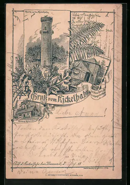 Vorläufer-Lithographie Ilmenau, 1894, Kickelhahn, Sabelbach-Restauration, Goethehäuschen