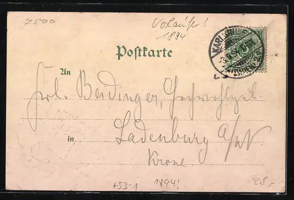 Personenbezogene Daten auf der Rückseite der Karte wurden durch blauen Textmarker unkenntlich gemacht. Die blauen Stellen sind auf die Vorderseite durchgeweicht und wirken sich negativ auf das Postkartenfoto aus