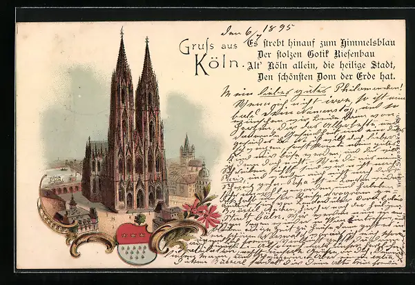 Vorläufer-Lithographie Köln, 1895, Dom im Stadtbild, Wappen
