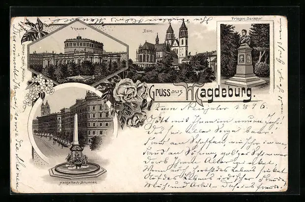 Vorläufer-Lithographie Magdeburg, 1895, Theater, Dom, Friesen-Denkmal
