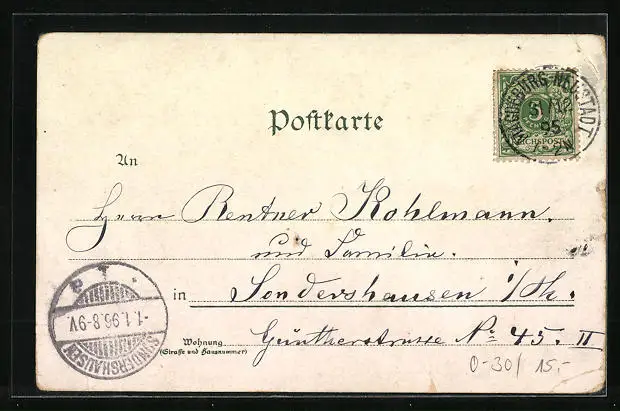 gelaufen 1895, Eckknicke, minimaler Einriss li. mittig u. li. unten, Stecknadelloch li. oben u. mittig