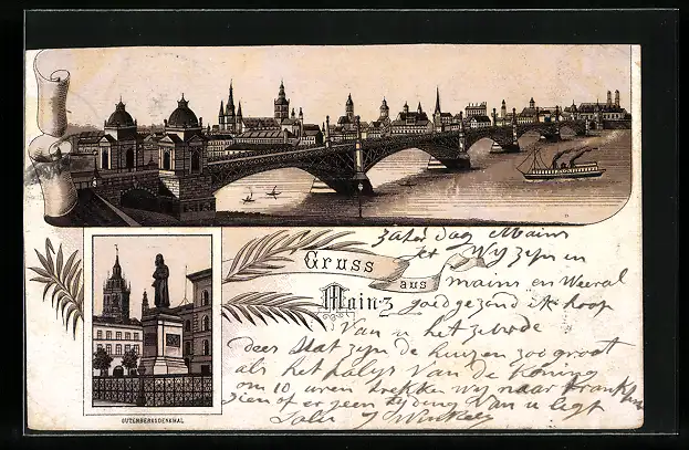 Vorläufer-Lithographie Mainz, 1893, Stadtpanorama und Gutenbergdenkmal