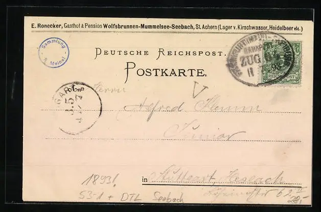 Personenbezogene Daten auf der Rückseite der Karte wurden durch blauen Textmarker unkenntlich gemacht. Die blauen Stellen sind auf die Vorderseite durchgeweicht und wirken sich negativ auf das Postkartenfoto aus