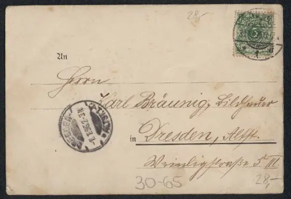 gelaufen 1895, Eckknicke, Kante bestoßen oben, guter Zustand