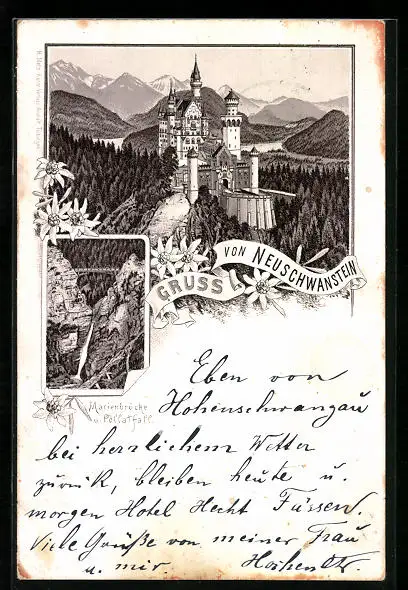 Vorläufer-Lithographie Neuschwanstein, Schloss Neuschwanstein, Marienbrücke 1895