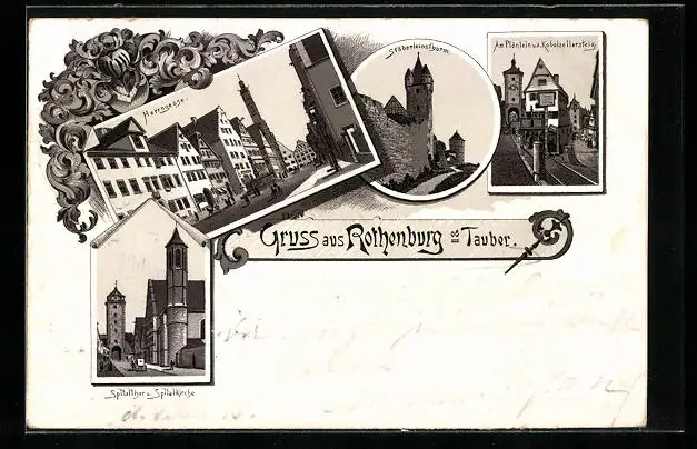 Vorläufer-Lithographie Rothenburg ob der Tauber, Spitalthor und Spitalkirche, Stöberleinsthurm, Herrngasse, 1895