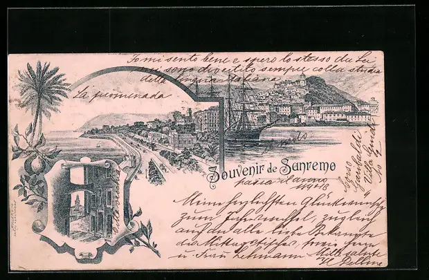 Vorläufer-Lithographie San Remo, 1892, Teilansicht, Promenade