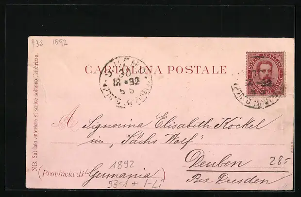 gelaufen 1892, Einriss re. oben, guter Zustand