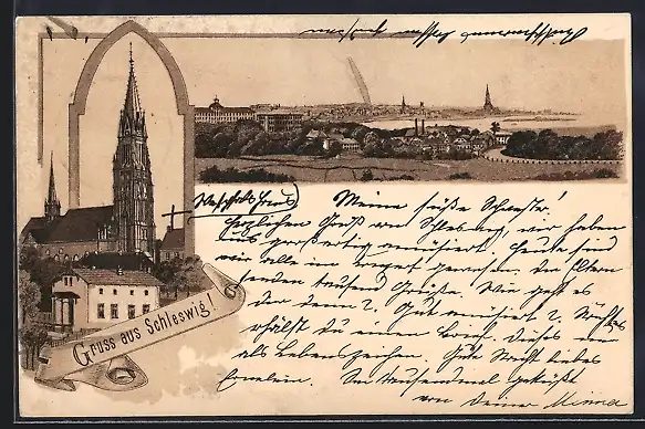 Vorläufer-Lithographie Schleswig, 1894, Kirche und Ortsansicht