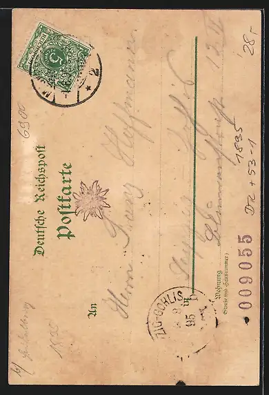 Personenbezogene Daten auf der Rückseite der Karte wurden durch blauen Textmarker unkenntlich gemacht. Die blauen Stellen sind auf die Vorderseite durchgeweicht und wirken sich negativ auf das Postkartenfoto aus