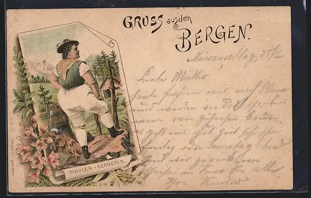 Vorläufer-Lithographie Tiroler Sennerin in den Bergen