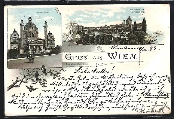 Vorläufer-Lithographie Wien, 1893, Karlskirche, Elisabethbrücke und Karlskirche