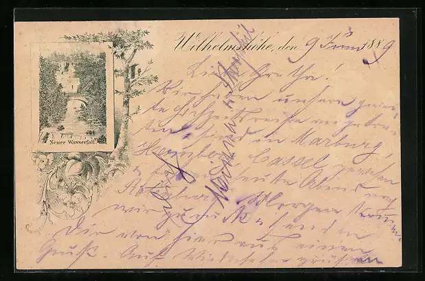Vorläufer-Lithographie Wilhelmshöhe, 1889, Neuer Wasserfall im Wald-Passepartout