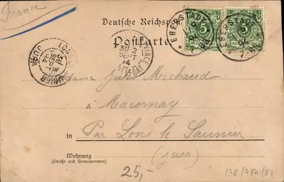 Zustand, siehe Scan, gelaufen, 1894 - ca 14 cm X 9 cm