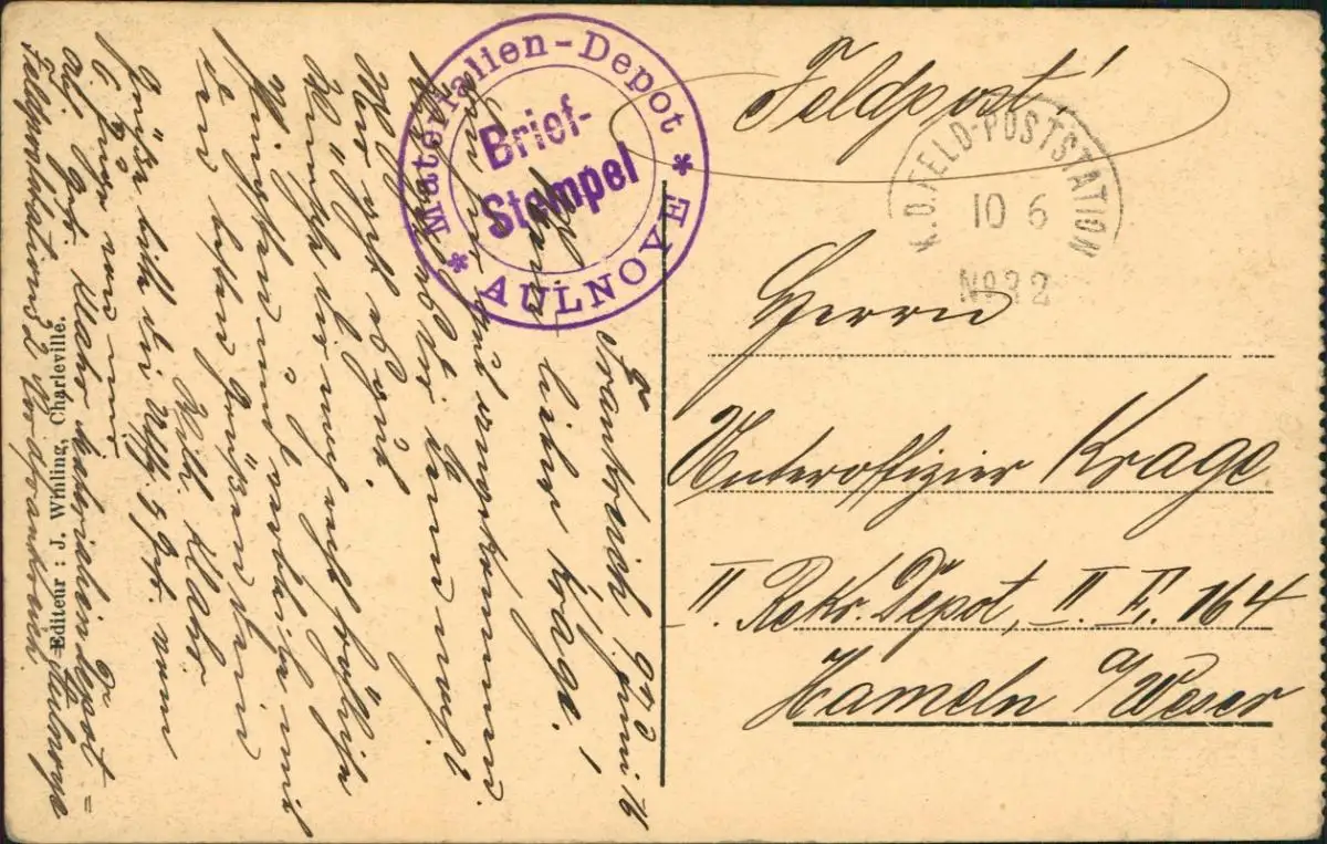 gel. Feldpoststempel Materialien Depot Aulnoye