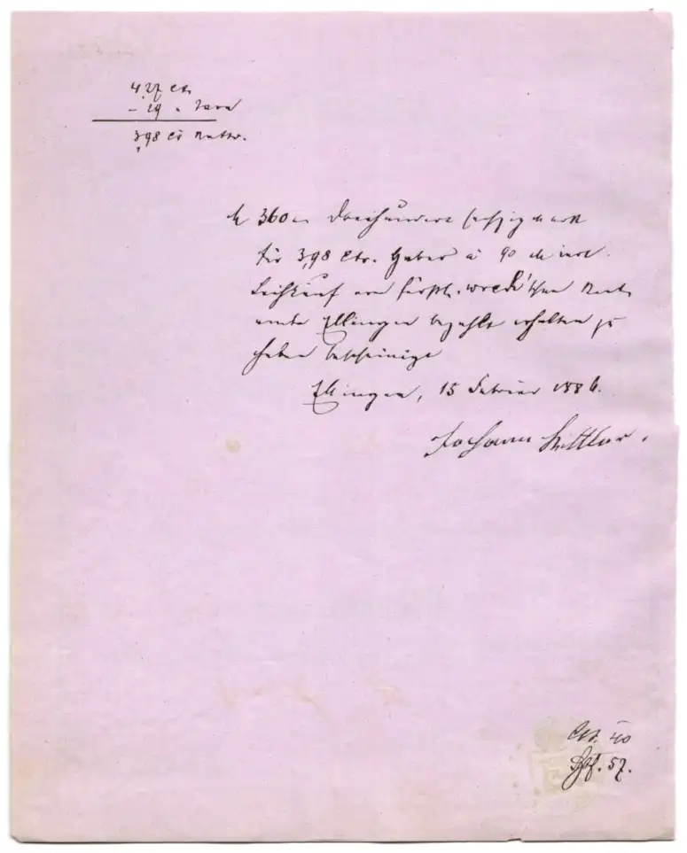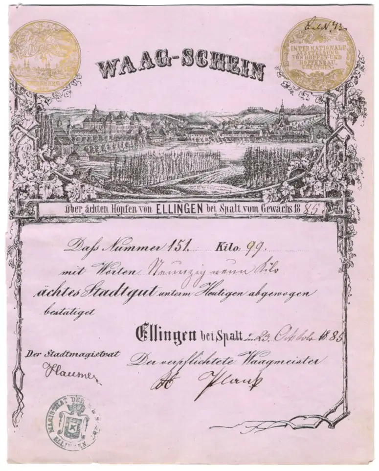 Waag-Schein Ellingen bei Spalt 1885, Ortsansicht mit Hopfenanbau, Wiege-Nummer 155