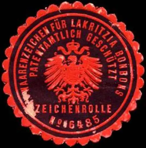 Waarenzeichen für Lakritzia Bonbons, Patentamt, Größe/Zustand: 4 , beschädigt, Original Verschluss-Siegelmarke aus Papier welche früher von Behörden, Firmen etc. zum Versiegeln der Briefe benutzt wurden