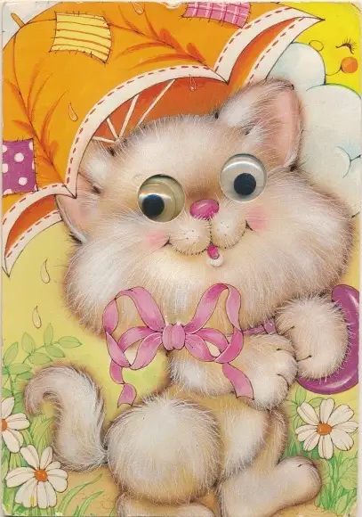 Wackelaugen Ak Katze, Tier-Portrait, Regenschirm, Schleife