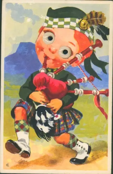 Wackelaugen Ak Kind in schottischen Trachten, Sackpfeife