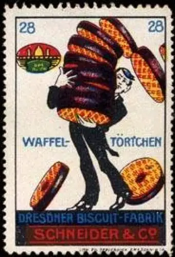 Waffeln, Kekse, Nr. 28, Dresdner Biscuit - Fabrik Schneider & Co., Größe/Zustand: 5x3 , guter Zustand, Original alte Reklamemarke die seinerzeit für die Werbung benutzt wurde