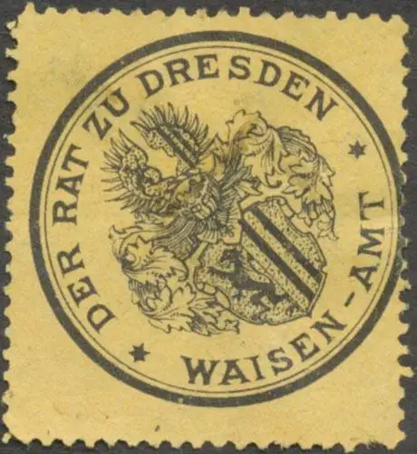 Waisen-Amt, der Rat zu Dresden, ocker, schwarz, Größe/Zustand: 4x3 , guter Zustand, Original Verschluss-Siegelmarke aus Papier welche früher von Behörden, Firmen etc. zum Versiegeln der Briefe benutzt wurden