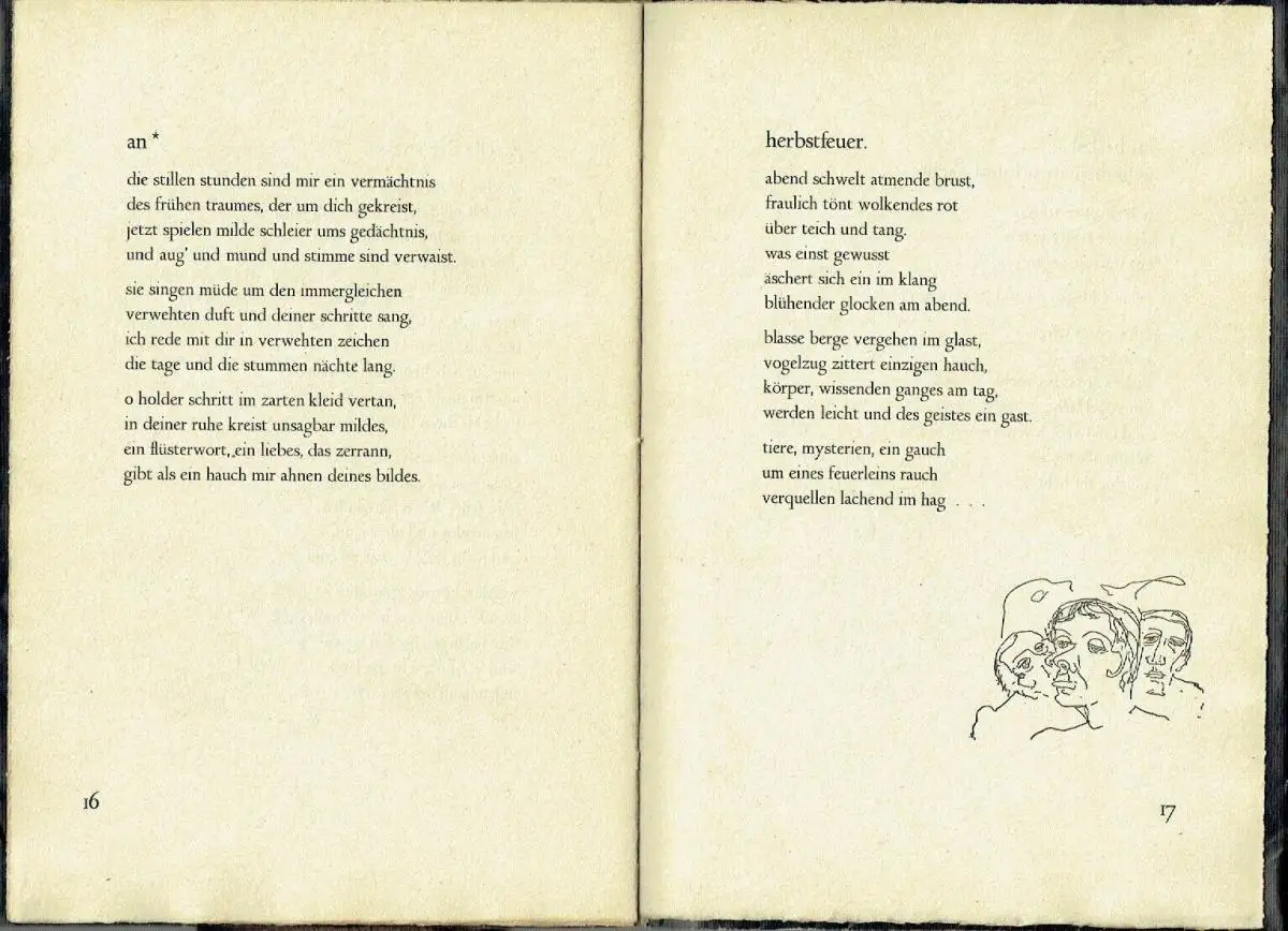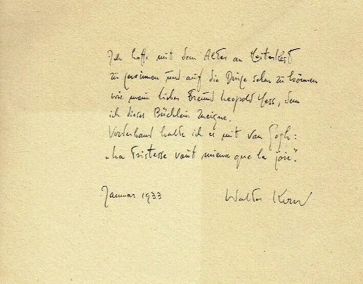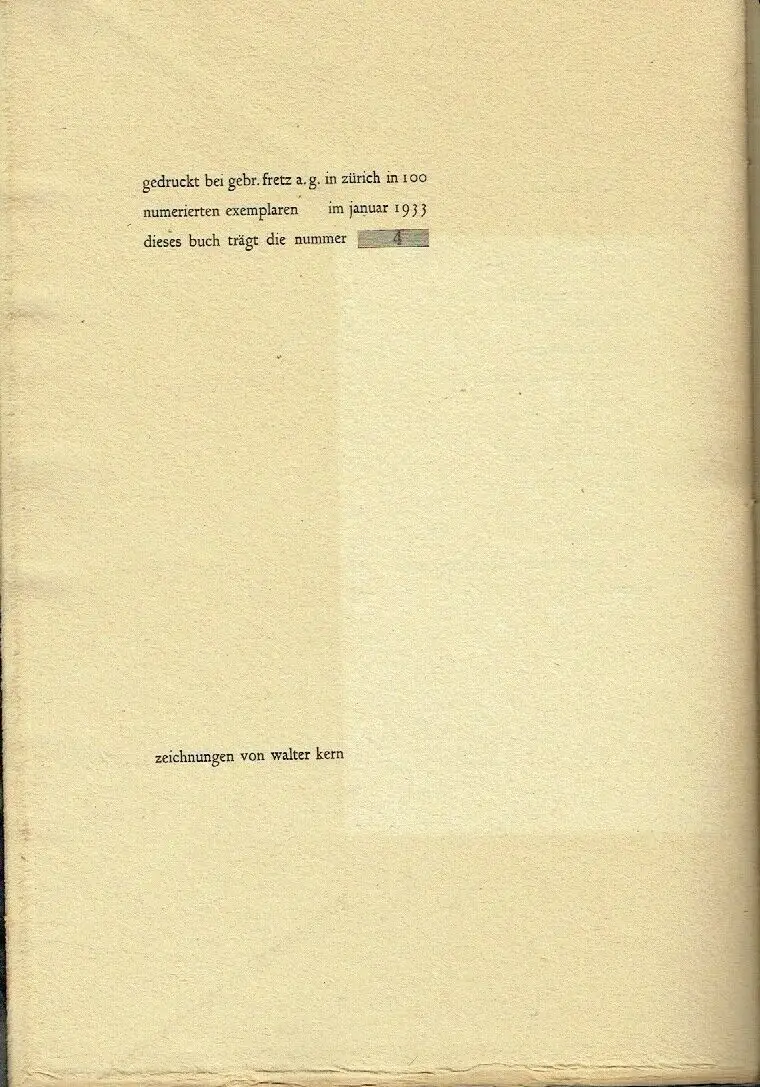 guter Zustand, geringe Gebrauchs- und Alterungsspuren: Schutzumschlag gering defekt - Papier teils etwas vergilbt, aber Seiten sauber und ordentlich, mit Widmung des Dichters vom Januar 1933, gedruckt bei Gebr. Fretz AG in Zürich in 100 nummerierten Exemplaren im Januar 1933 (No. 4) "Der Maler, Schriftsteller und Kunstkritiker Walter Kern (1898–1966) stellte bereits 1917 im Kunsthaus Zürich aus und zog 1919 mit seinem Jugendfreund, dem Zeichner und Maler Robert Schürch, nach Genf. 1920–22 arbeitete Kern als kaufmännischer Angestellter und als freischaffender Maler in Madrid und Florenz. 1922–27 fand er in Thun eine Anstellung als Fremdsprachenkorrespondent und publizierte 1924 seinen ersten Gedichtband. 1928–1930 arbeitete er als Werbe- und Verkaufschef in Zürich, 1928 stellte er ausserdem an der Nationalen Kunstausstellung aus und gab 1930 Gedichte von Hans Arp heraus. 1930–1943 amtete er als Verkehrsdirektor von Davos und schrieb in dieser Zeit Monografien über Oscar Lüthy, Franz Rederer, Hermann Huber, Oskar Kokoschka und über die Malerei in Graubünden. 1944–1953 arbeitete Kern als selbständiger Werbeberater und publizierte zu Otto Meyer-Amden, Henri de Toulouse-Lautrec und Turo Pedretti. 1948–1961 war er Mitglied der AICA, der Association Internationale des Critiques d’Art, 1965 wurde er zum Ehrenpräsident der Sektion Schweiz ernannt. 1953–1964 führte Kern die Buchdruckerei Winterthur und arbeitete bis zu seinem Tod als Schriftsteller und Maler in Uttwil am Bodensee." (sik-isea.ch/de-ch/Kunstarchiv), kartoniert, ca. 19,5 x 28,5, 20 Seiten mit einigen Zeichnungen