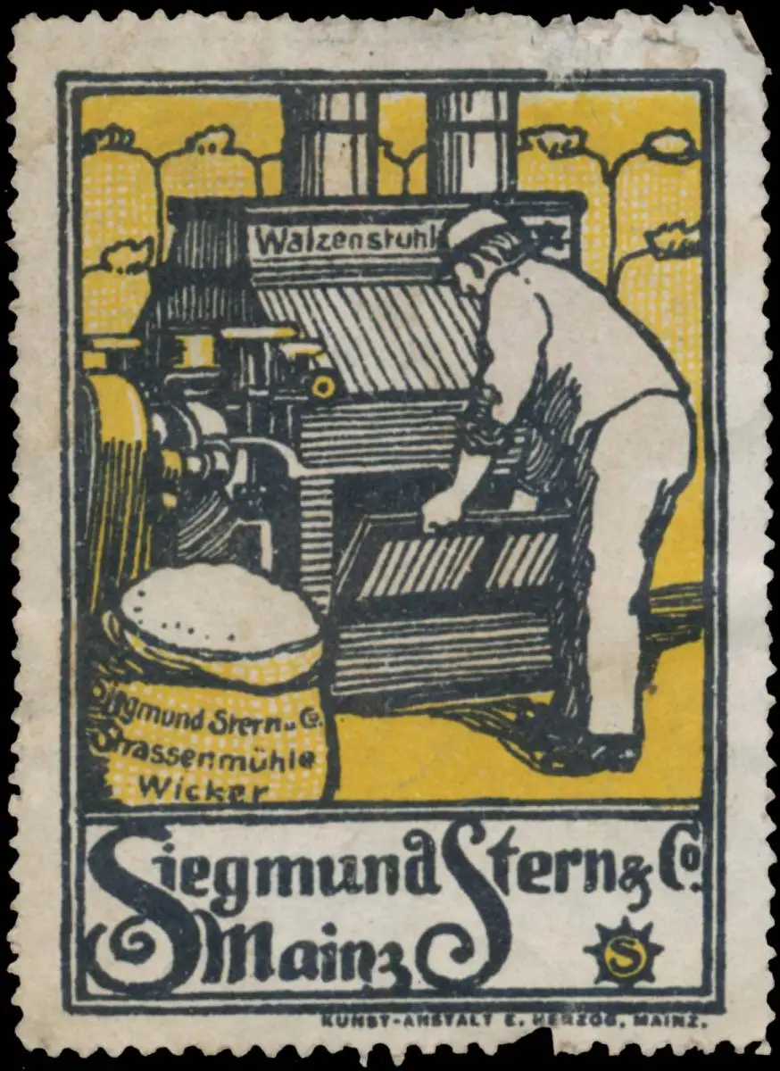 Strassenmühle Wicker, Mühle, Druck: Kunstanstalt E. Herzog, Mainz, Größe/Zustand: 6x4 , beschädigt, Original alte Reklamemarke die seinerzeit für die Werbung benutzt wurde
