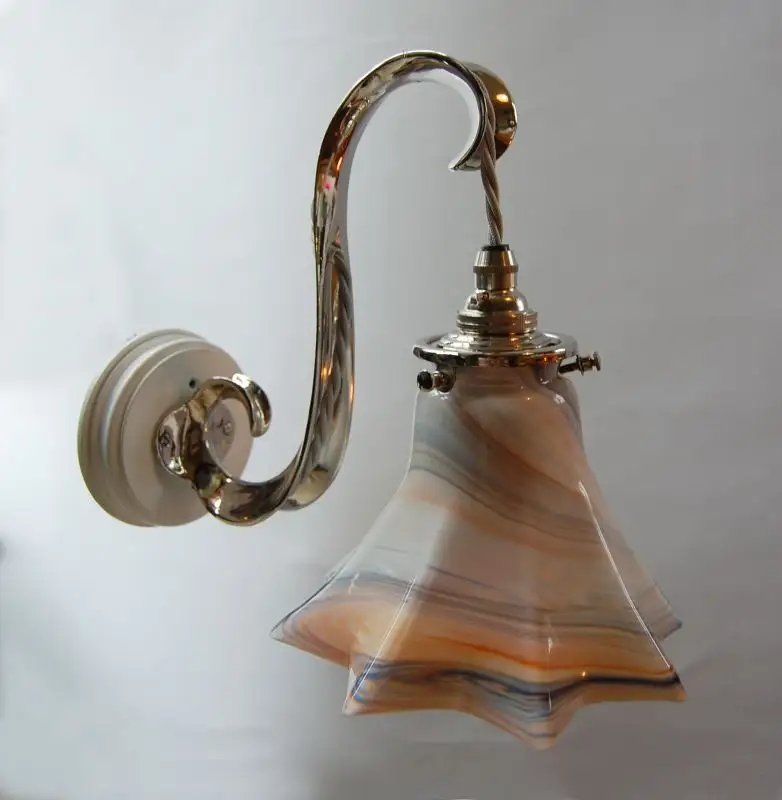 Gussmessing vernickelt oder poliertes Messing / Kabel: silver oder gold, textilumsponnen / Rückplatte aus Holz / bajonettsockel / inkl. Leuchtmittel