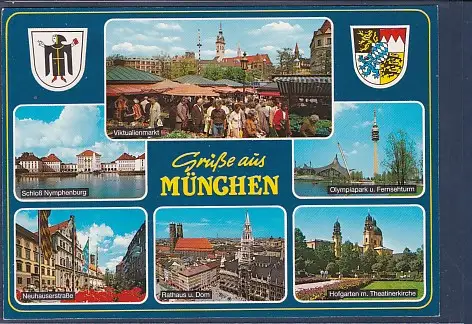 Wappen AK Grüße aus München 6.Ansichten Viktualienmarkt - Schloß Nymphenburg - Olympiapark u. Fernsehturm - Neuhauserstraße - Rathaus u. Dom - Hofgarten m Theatinerkirche, nicht gelaufen von ca. 2000