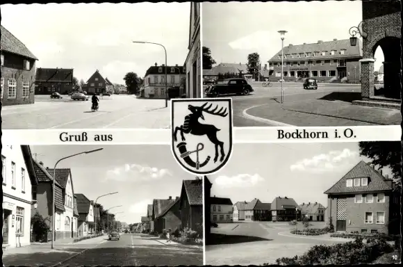 Wappen Ak Bockhorn in Oldenburg Friesland, Platz, Straßenpartie, Wohnhäuser