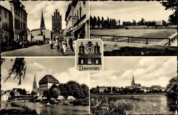 Wappen Ak Demmin in Vorpommern, Sportplatz, Stadtansicht, Straßenansicht