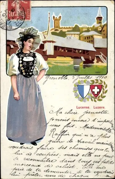 Wappen Ak Luzern Stadt Schweiz, Stadtbild, Frau in Luzerner Tracht
