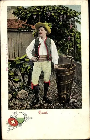 Wappen Ak Vaud Kanton Waadt, Mann in Volkstracht, Weintrauben