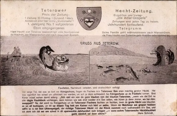 Wappen Künstler Ak Teterow in Mecklenburg, Teterower Hecht Zeitung, Gedicht M. Schmidt