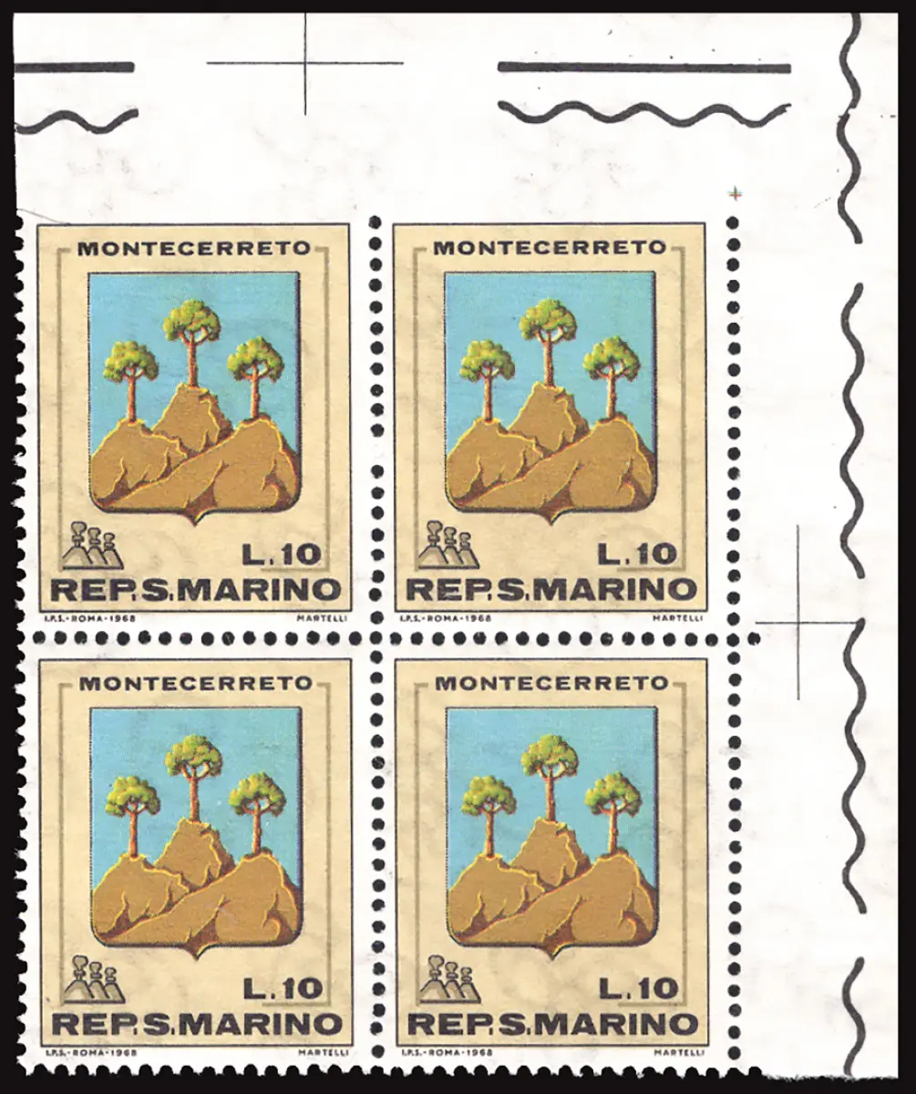 MNH - Vollgummi - - Wappen Lire 10 Nr. 758a prächtiges Viertel a. von f. mit den oberen ungezahnten Exemplaren oben - Selten, im Provenienzblatt befinden sich nur sechs Exemplare mit dieser edlen Sorte - Kat. euro 4.000 Cod.848/182
