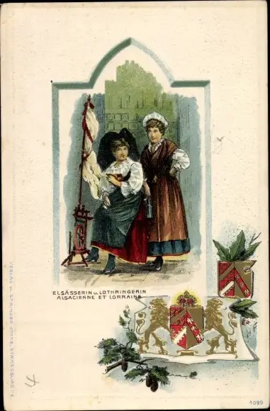 Wappen Litho Elsässerin und Lothringerin in Trachten, Spinnrad