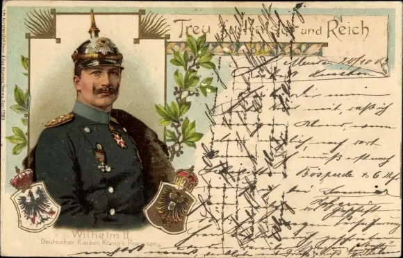 Wappen Litho Treu zu Kaiser und Reich, Kaiser Wilhelm II., Portrait in Uniform