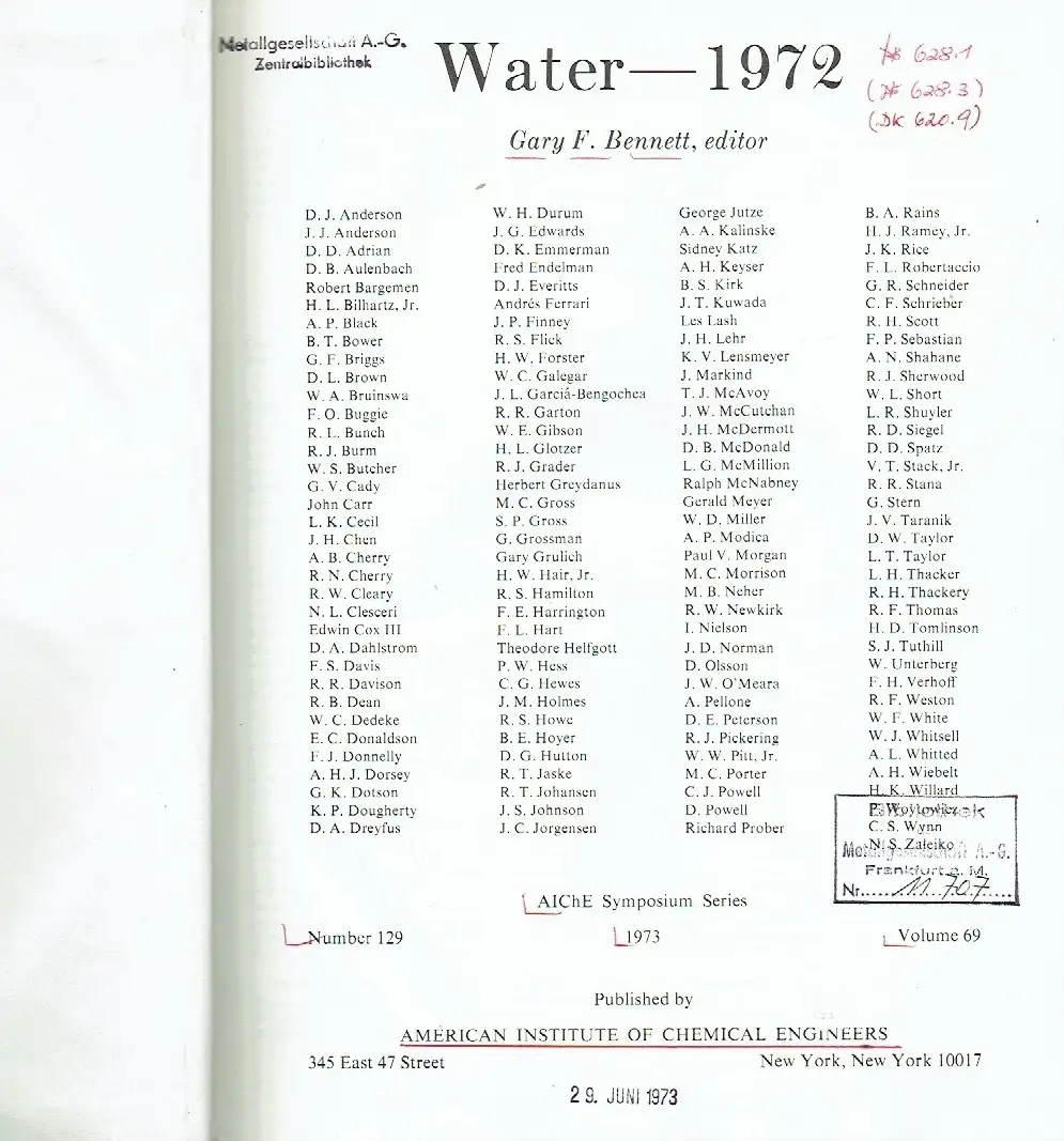 guter Zustand, Gebrauchs- und Alterungsspuren: ehemaliges Bibliotheksexemplar - Rücken mit Filzstift-Nummerierung - Titel mit Stempeln und Notizen - Deckel innen mit angeklebtem Papierrest - Seiten aber sauber und ordentlich, selten mit kleinen Randblessuren - Bindung gelockert, in beiden Vorsätzen Gelenke etwas aufgerissen - Rückseite mit 2 kleinen Druckstellen, Coagulation Of Pulp And Paper Aerated Lagoon Effluents For Color and Solids Removal    H. K. Willard and R. H. Scott - Process Selection For The Removal Of Radionuclides From Low-Level Wastes At Oak Ridge National Laboratory    J. M. Holmes and F. E. Harrington - Dewatering Of Sewage Sludges - Dewatering Sewage Sludge On Sand Beds    D. D. Adrian - Economic Costs Of Dewatering Sewage Sludges By Continuous Vacuum Filtration    R. J. Sherwood and D. A. Dahlstrom - Sludge Dewatering By Pressure Filtration    H. W. Forster - Fifteen Years Of Experience Dewatering Municipal Wastes With Continuous Centrifuges    W. F. White - Cost Of Dewatering And Disposing Of Sludge On The Land   G. K. Dotson, R. B. Dean, and G. Stern - Nutrients - Mass Transport Of Metabolites, Especially Phosphates In Cells F. H. Verhoff - Phosphate Removal By Selective Ion Exchange With Supported Hydrous Ferric Oxide  Richard Prober and K. P. Dougherty - Perspective On The Phosphorus Panic    J. D. Norman - Sources And Sinks Of Nitrogen And Phosphorus: Water Quality Management Of Lake George (N.Y.)   D. B. Aulenback and N. L. Clesceri - The Eutrophication Control Program Of The Organization For Economic Cooperation And Development    R. L. Bunch - Environmental Pollutants - 2,4,5-T    F. S. Davis - The Case Against Mercury  R. B. Dean - Biological Effects Of Cooling Tower Blowdown   Ronald B. Garton - Dichlorodiphenyl Trichloroethane (Should DDT be Banned Or Praised?)   J. G. Edwards - Ground Water For Municipal Usage - Introduction    J. H. Mcdermott - Ground Water For Municipal Use    R. N. Cherry and W. H. Durum - Chemical Engineering, Municipal Ground Water Supplies, And Public Health    W. J. Whitsell - Chemical Quality Of Ground Water Influences Design And Performance of Water Wells    G. F. Briggs - Chemical Products And Techniques For Water Well Development     W. D. Miller - Groundwater — An Imperative In Water Resources Planning (Abstract)    J. H. Lehr - Ground Water as a Water Resource - Introduction    J. L. Garcia-Bengochea - New Trends In The Usage Of Natural Underground Reservoirs   Gerald Meyer - Developments In Municipal Ground Water Treatment Practices   J. L. Garcid-Bengochea and A. P. Black - Well-Injection System For Industrial Waste   R. T. Johansen and E. C. Donaldson - Regulatory And Legal Aspects Of Aquifer Management   L. G.  Mcmillion and D. Olsson - Rivers As Water Supply For Domestic And Industrial Use - Rivers As A Water Supply For Domestic And Industrial Use   B. T. Bower and R. T. Jaske - Experiences In Regional Water Quality Management, The Great Miami River, Ohio     R. F. Thomas - Thermal Capacity Of The Mississippi River Basin    D. E. Peterson - Regional Water Quality Management: A Case Study Of The Wisconsin River   R. S. Howe and H. J. Dorsey - River Water Quality Monitoring And Assessment - Some Chemical And Biological Characteristics Of The Mississippi River Bor-Dering Iowa    D. B. Mcdonald - Mississippi River Temperatures And The Simulated Effect Of A Thermal Discharge    H. D. Tomlinson and K. V. Lensmeyer - Thermal Remote Sensing On The Mississippi River in Iowa   S. J. Tuthill, J. V. Taranik, and B. E. Hoyer - Water Quality Monitoring On The Mississippi River Has Its Pitfalls    B. A. Rains and R. S. Flick - Pollution Abatement Programs In The Delaware River Estuary     S. P. Gross - Unsteady State, Three-Dimensional Model Of Thermal Pollution In Rivers     R. W. Cleary, T. J. Mcavoy, and W. L. Short - Computer Control And Modeling Of Sewer Systems    J. J. Anderson and D. J. Anderson - Geothermal Energy Resources - Geothermal Power Plant Design    J. T. Kuwada - Model Studies Of Geothermal Steam Production   G. V.  Cady, H. L. Bilhartz, Jr., and H. J. Ramey, Jr. - The Role Of State Government In The Development Of A Geothermal Resource    D. J. Everitts - The Geysers Geothermal Power Plant    J. P.  Finney - Problems For Che Students - A Series Of Problems On Industrial Water Processes For Use By Chemical Engineers    Fred Endelman And Richard Prober - a. m. o, Kunstleder, ca. 21,5 x 28, 658 Seiten mit einigen Bildern