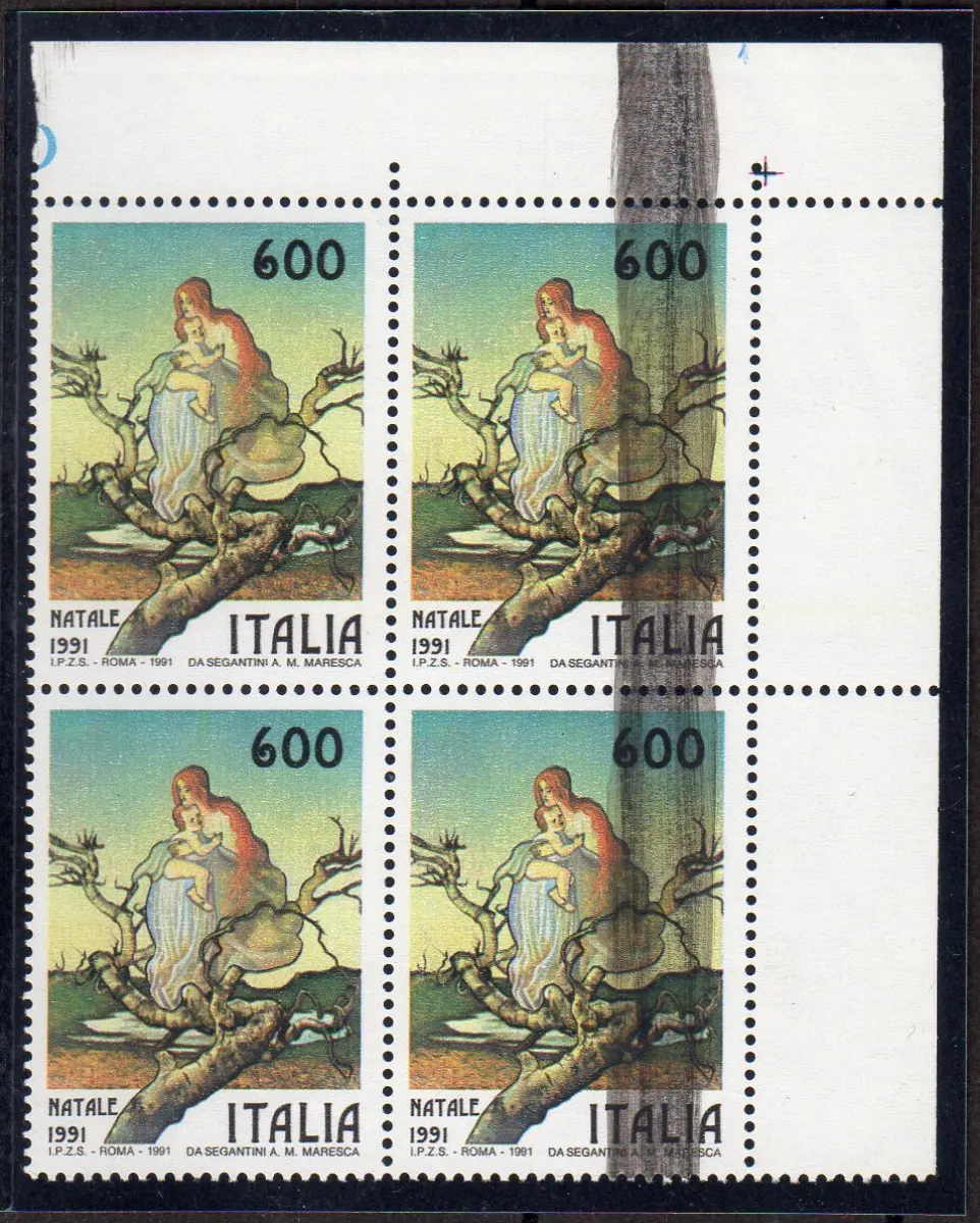Weihnachten '91 Viertelsorte Farbband Vollgummi MNH - Weihnachten '91 Nr. 1979 Viertel a. von f. mit großem Farbspektrum auf zwei Exemplaren zum Entgraten von Schwarz bei der Verarbeitung - auffällige Gelegenheitssorte Cod. 690/15
