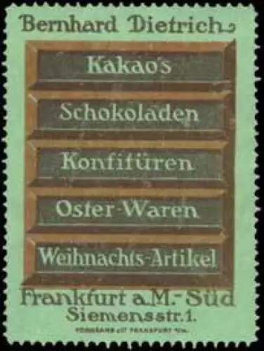Bernhard Dietrich Kakaos, Schokoladen, Konfitüren, Oster-Waren, Weihnachten, Größe/Zustand: 5x4 , leicht geknittert, Original alte Reklamemarke die seinerzeit für die Werbung benutzt wurde