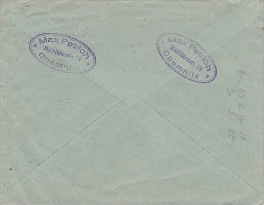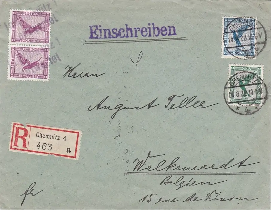 Weimar: Einschreiben von Chemnitz nach Belgien 1928