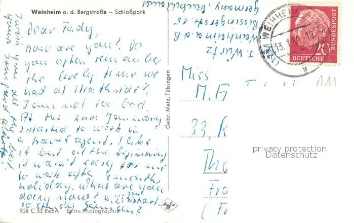 Weinheim_Bergstrasse Schlo?park Weinheim_Bergstrasse postalisch gelaufen 1959 Erhaltung siehe scans [LiesaD40] LiesID40