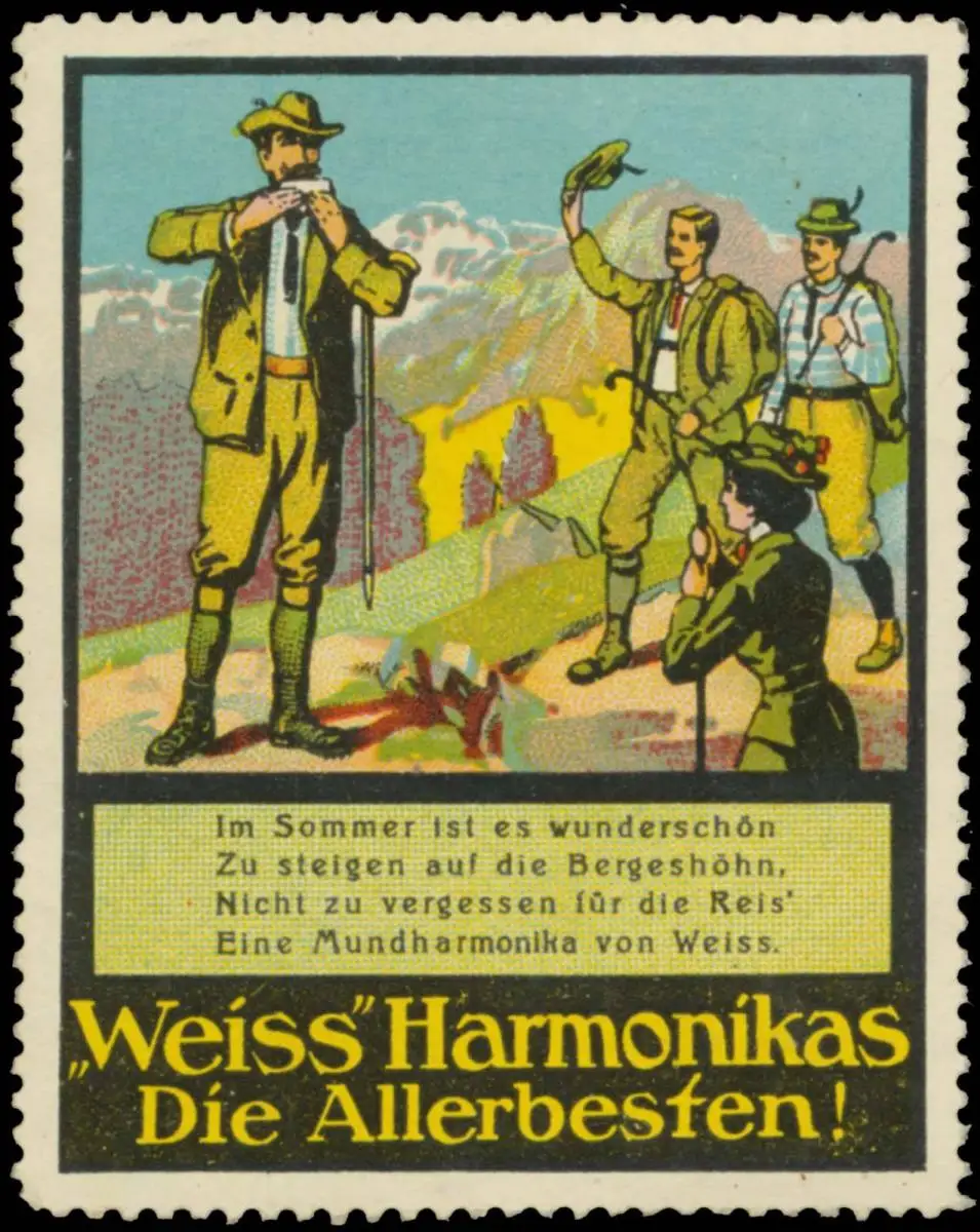 Im Sommer ist es wunderschön zu steigen auf die Bergeshöhn, nicht zu vergessen für die Reis, eine Mundharmonika von Weiss. Wandern, Größe/Zustand: 6x5 , guter Zustand, Original alte Reklamemarke die seinerzeit für die Werbung benutzt wurde