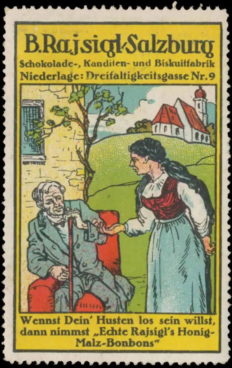 dann nimmst Echte Rajsigls Honig-Malz-Bonbons, Niederlage: Dreifaltigkeitsgasse 9, Schokolade-, Kanditen- und Biskuitfabrik, Größe/Zustand: 7x4 , guter Zustand, Original alte Reklamemarke die seinerzeit für die Werbung benutzt wurde