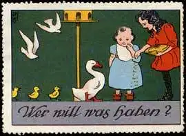 Kinder füttern Taube und Gans, Größe/Zustand: 5x7 , guter Zustand, Original alte Reklamemarke die seinerzeit für die Werbung benutzt wurde