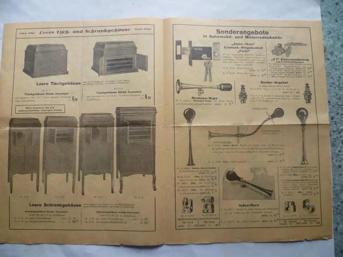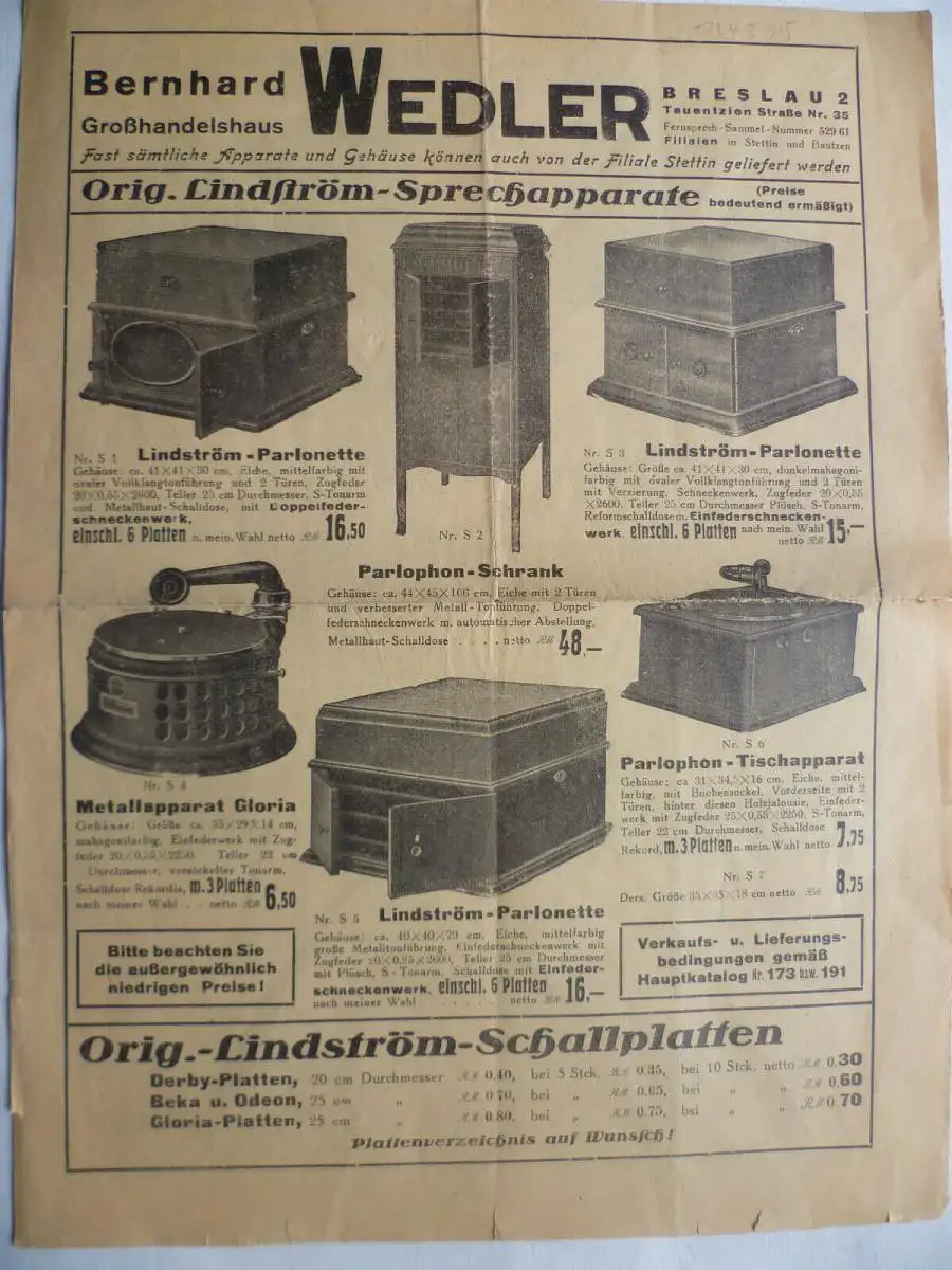4seitiger Werbeprospekt Großhandelshaus Bernhard Wedler Breslau Schlesien über Sprechapparate, Schrankgehäuse für Rundfunk-Empfänger, Automobil- und Motorradzubehör. Zweifach gefaltet, an den Faltstellen gering beschädigt, sonst gut erhalten.