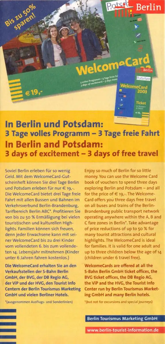 Prospekt, touristisches Faltblatt Werbeprospekt Berlin, WelcomeCard Erscheinungsjahr: 2003 Herausgeber: Berlin Tourismus Marketing GmbH Format: 10 x 21 cm, gefaltet Versandgewicht: 20 g Der