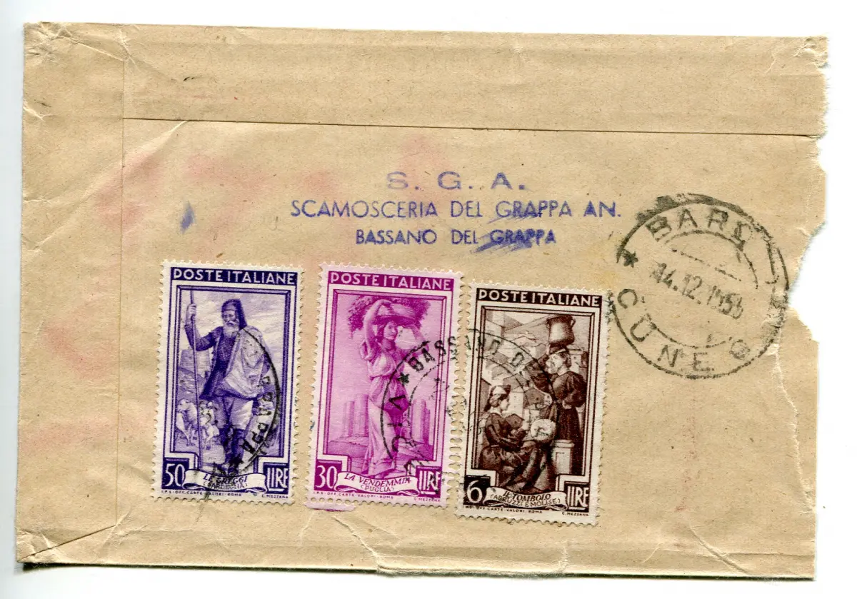 - Wertlose Probe - Kleiner Umschlag, der am 14.12.56 per Express von Bari nach Barolo verschickt wurde, frankiert für 86 Lire mit drei Werten der Serie Lavoro - (Nr. 638, 644, 647) - Die 6-Lire-Briefmarke mit leichtem Defekt - Ungewöhnliche Nr. 311/L