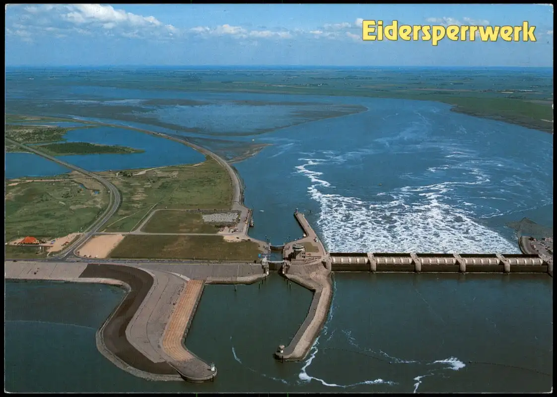 Wesselburenerkoog Eiderdamm mit Sperrwerk v. Flugzeug aus, Luftaufnahme 1990