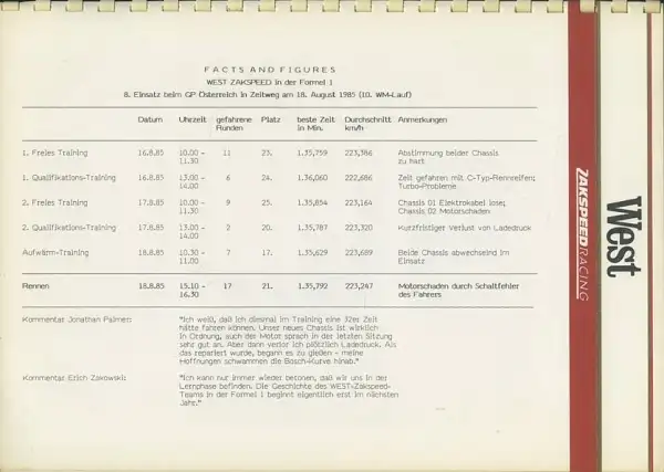 Ca. 30 Seiten DinA4, 1 Foto von Christian Danner Detail der Saison 1985 für Zakspeed, Einsätze, Rundenzeiten u.a. Guter Zustand